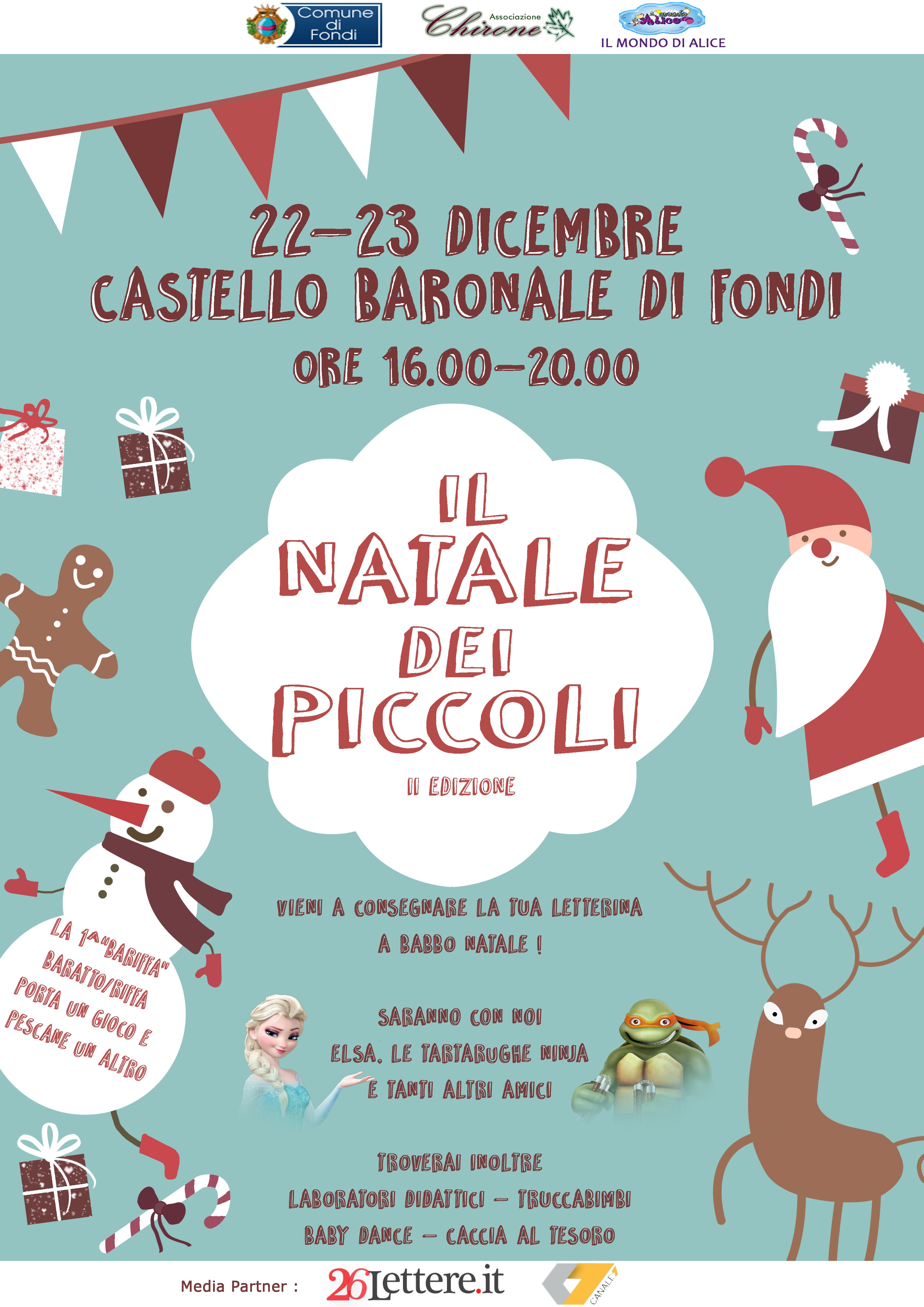 In collaborazione con lo store “Il Mondo di Alice” e con il patrocinio del Comune di Fondi, la Chirone martedì 22 e mercoledì 23 dicembre invita tutti i bambini della città a partecipare a questo fantastico evento che vede proprio loro come protagonisti. Tantissime le attività proposte all’interno del Castello Baronale di Fondi a partire dai diversi laboratori didattici per finire alla postazione truccabimbi.