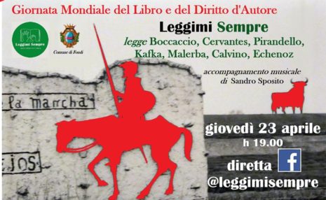 Alle ore 19.00, Leggimi Sempre – piattaforma attiva nella diffusione della letteratura nel Sud Pontino – proporrà la lettura in diretta Facebook di brani, novelle e frammenti di Giovanni Boccaccio, Miguel de Cervantes, Luigi Pirandello, Luigi Malerba, Franz Kafka, Italo Calvino e Jean Echenoz. L’indirizzo è http://www.facebook.com/leggimisempre/
